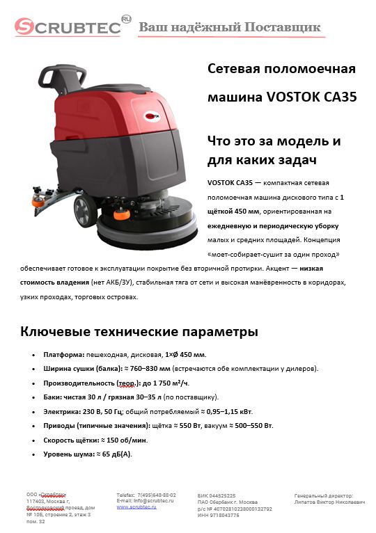 VOSTOK CA35 — компактная сетевая (230 В) толкаемая поломоечная машина для ежедневной и периодической влажной уборки малых и средних помещений. По габаритам и ширине щётки — «середина» класса 35–45 см: манёвренность на тесных участках, быстрое высушивание за один проход. Модель ориентирована на объекты с доступом к розетке, где не требуется аккумуляторный парк и важны низкие эксплуатационные затраты.