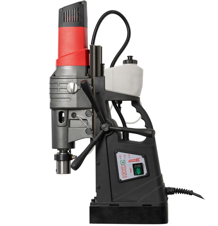 RODMIX RMD-120ТМ/4 — тяжёлый промышленный магнитный сверлильный станок повышенной мощности, предназначенный для крупных диаметров сверления по месту в металлоконструкциях. Модель относится к старшему классу mag-drill и рассчитана на корончатое сверление до Ø120 мм, а также на силовые операции, включая зенкование и резьбонарезание, благодаря реверсу, 4-ступенчатой коробке скоростей и посадке КМ4–W32.