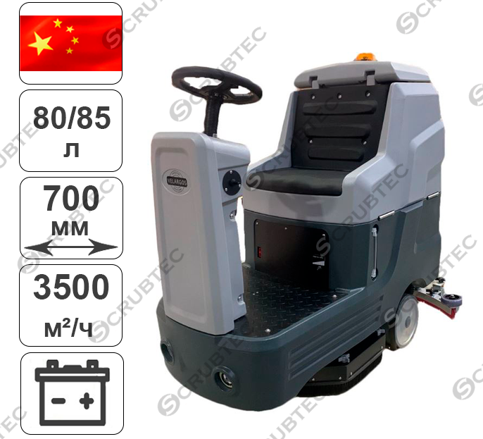 - Форм-фактор: ездовая (оператор сидит), дисковые щётки 2ר 350–360 мм → рабочая зона ≈700 мм.