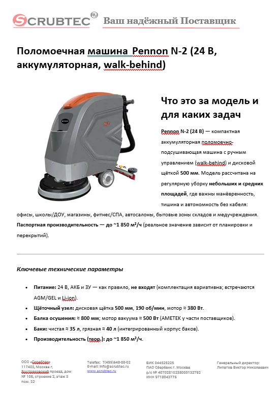Pennon N-2 (24 В) — компактная аккумуляторная поломоечно-подсушивающая машина с ручным управлением (walk-behind) и дисковой щёткой 500 мм. Модель рассчитана на регулярную уборку небольших и средних площадей, где важны манёвренность, тишина и автономность без кабеля: офисы, школы/ДОУ, магазины, фитнес/СПА, автосалоны, бытовые зоны складов и медучреждения. Паспортная производительность — до ~1 850 м²/ч (реальное значение зависит от планировки и перекрытий).