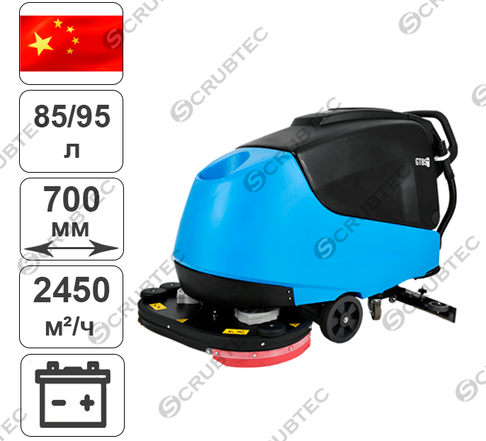 Gadlee GT85 BT70 — пешеходная дисковая поломоечная машина с приводом хода (BT) для регулярной уборки средних и крупных участков. Две щётки обеспечивают рабочую полосу ≈ 700 мм, за машиной установлена широкая балка с выглаживающими резинами. Концепция — «моет → собирает → сушит за один проход» с устойчивой досушкой на разворотах и минимизацией «подсушек» полотёром. Паспортная теоретическая производительность — ≈ 3 150 м²/ч; для реальных маршрутов планируют ≈ 1 600–2 450 м²/ч в зависимости от планировки и трафика.