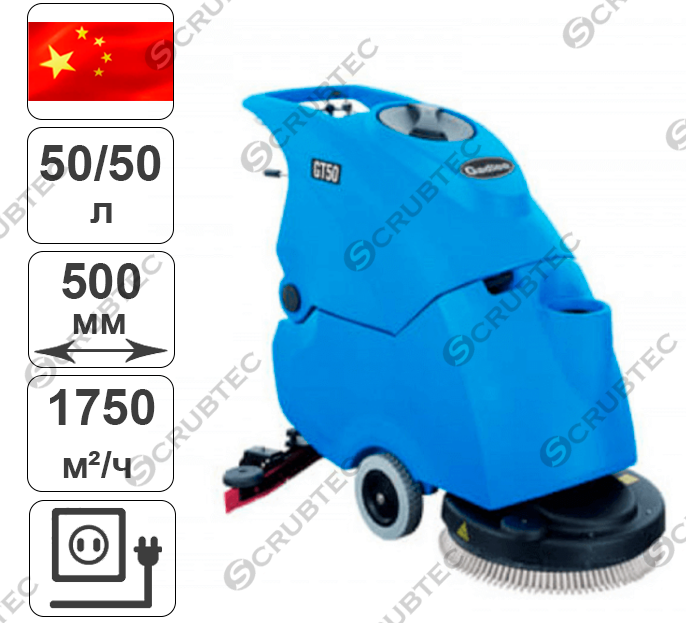 GT50 C50 — пешеходная дисковая поломоечная машина, работающая от сети 220 В. Типоразмер «50/50» означает щётка 500 мм и баки 50/50 л. Концепция «моет-собирает-сушит за один проход» для регулярной уборки малых и средних площадей с линейными маршрутами: коридоры, торговые галереи, зоны комплектования, кухни и подсобные помещения. Параболическая балка ≈ 815 мм даёт устойчивую сушку на разворотах. Теоретическая производительность — ~1 750 м²/ч.