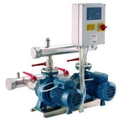 Насосная станция состоит из двух моноблочных центробежных насосов серии NM с запорным и обратным клапанами, установленных на общей раме, входного и выходного коллекторов, реле давления, манометра и шкафа управления.